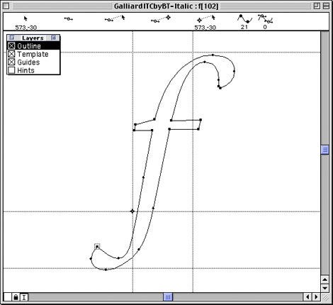 Kerning characters exist in computer fonts as well. Here, the view from within a font-editing program shows how this italic f extends beyond its side bearings — the digital equivalent of a metal type block — allowing it to overlap characters set next to it.