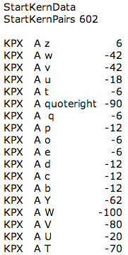 Part of the kerning table from the Adobe Garamond font. It’s a straightforward assignment of spacing adjustments to specific character pairs.