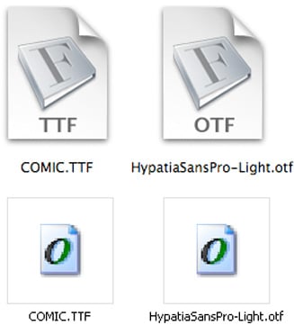 In the following examples (Mac above, Windows below), the Hypatia fonts contain PostScript font data, as indicated by its .otf filename extension. The Comic Sans fonts contain TrueType font data and get the extension .ttf.
