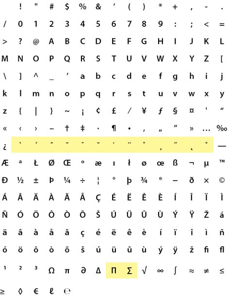 This array of characters illustrates the character set of what Adobe calls its “Standard” OpenType fonts. Except for the characters highlighted in yellow, this is the same character set used in Monotype’s “Basic” OpenType fonts.