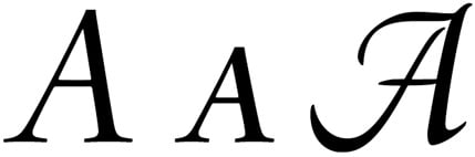An OpenType font can also contain more than one form of a character. OpenType is based on the Unicode character-I.D. system, which identifies all characters and symbols in all the world’s languages by a series of unique I.D. numbers. To keep this scheme manageable, Unicode recognizes that a single character — say, a capital A — can be have several different representations, each identified by a separate glyph, as seen here: