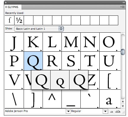 The little triangle in the corner of a character box in InDesign’s Glyphs panel indicates that alternative forms exist for that character. Clicking the triangle makes those alternates visible, as shown here.
