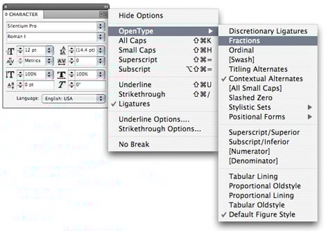 In Adobe InDesign, select OpenType from the Character palette menu, and a pop-up menu will show you which options are available for the font you’re using. Click on the ones you want to implement.