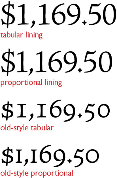 As I noted in my column “Pick a Numeral”, figures come in many forms, and OpenType fonts often offer you a variety to choose from, including lining and old-style figures in both tabular (monospaced) and proportional forms, as shown here: