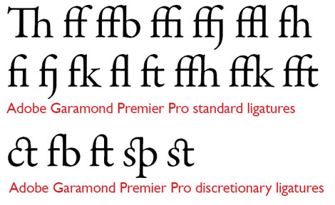 Almost all text fonts contain the fi and fl ligatures, but OpenType fonts may contain other common ones as well, such as ffi and ffl. They may also contain more offbeat or historical ones such as the ones shown below. Some fonts distinguish between “standard” ligatures and “historical” or “discretionary” ligatures so you don’t end up with odd or out-of-date looking type.