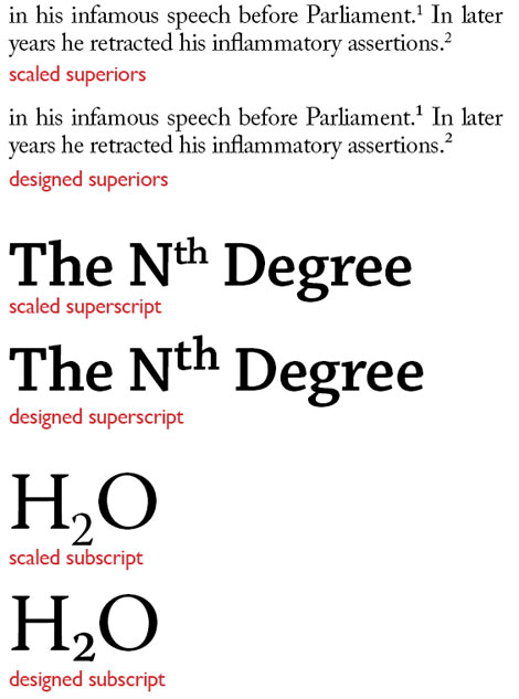 As in the case of small caps, fonts that include characters specifically designed for use as superscripts/subscripts and ordinals/superiors will yield better results than simply having your program scale full-size numerals to size for use in these roles.