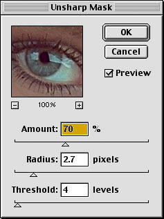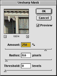 How can you best balance the three settings? The procedure I recommend is to start with an Amount setting in the 200-to-300-percent range and a Threshold of zero, and work the Radius setting until it matches the image content. Then adjust the Amount setting until the desired degree of sharpening is obtained. Finally, if necessary, increase the Threshold to smooth out oversharpened areas of texture.