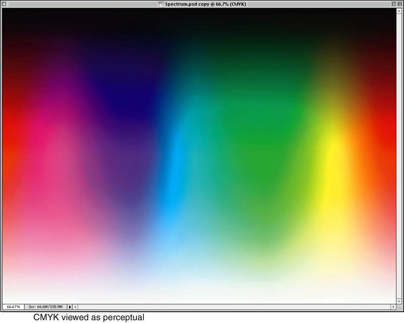 But when we view images that are already saved as CMYK files, we typically don’t want to use Perceptual rendering, or anything else that compresses the gamut further. At this point you may ask why, if the RGB gamut is larger than the CMYK gamut, would any gamut compression take place when you used Perceptual rendering to display CMYK?