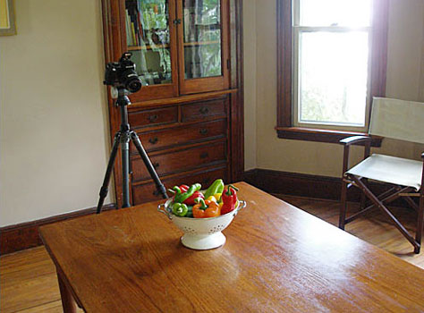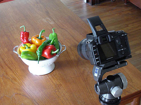After arranging the peppers in the strainer, we placed the strainer on a dining room table, mounted a digital camera to a tripod and framed up the shot (Figure 1). In this situation, the light from the windows would serve to illuminate the shot.