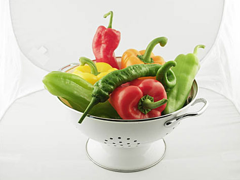 To demonstrate the silhouetted technique, we photographed a strainer full of peppers. For comparison sake, we started with taking pictures of the peppers the way most people would tackle such a shot.