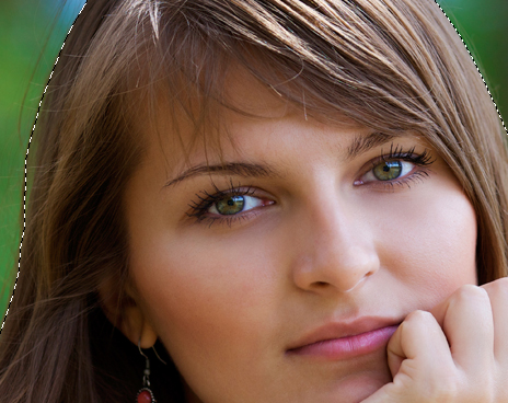 It’s easily fixed. In the Layers panel, click the mask — the box small white-and-black box to the right on the model’s layer. Then select the white area using your tool of choice, make sure that the foreground color on the bottom of the Tools panel is set to black, and press Option-Delete (PC: Alt-Backspace). This masks out those areas. If any spots are left, use the Brush tool to paint black onto the mask where the pixels need to be masked out. Note: To see the actual mask, click on the layer mask while pressing Option (PC: Alt). Click again to return to pixels.