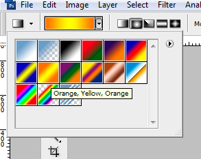 Select the Gradient Tool from the Tools panel and then choose a color gradient from the Options panel at the top of the screen. I chose the Orange, Yellow, Orange gradient.