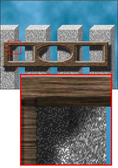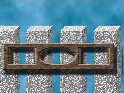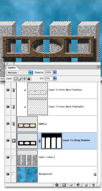 As you can see in the layers palette, this artwork consists of three layers: The top object, with both a Drop Shadow and a Bevel and Emboss applied as a layer style; a middle layer that contains the four “pillars;” and a Background layer with a “sky.”