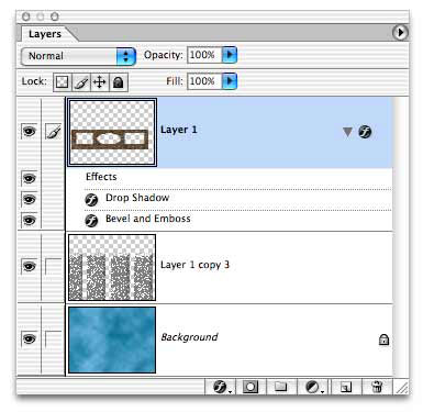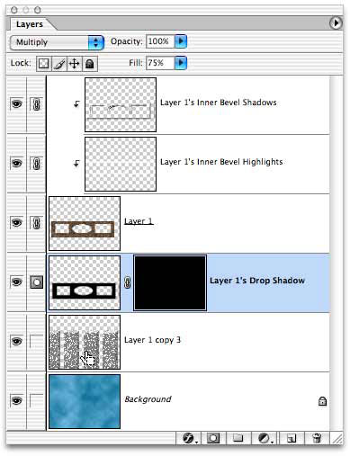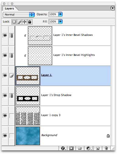 In the Layers palette, note that the new layer “Layer 1’s Drop Shadow” was created below the original layer, while the shadows and highlights of the bevel were added above the original layer. Also observe that immediately after creating the layers, I linked them to the original Layer 1. This prevents accidental misalignment of the elements, which could lead to an unwanted (but rather interesting) mis-registration effect.