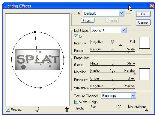 Go to Filter > Render > Lighting Effects. Set it up as shown in Figure 8. Be sure to select the Blue copy channel as the Texture Channel.