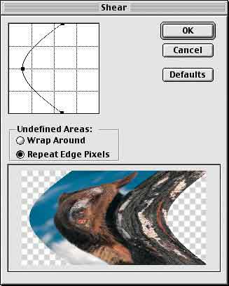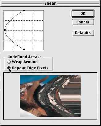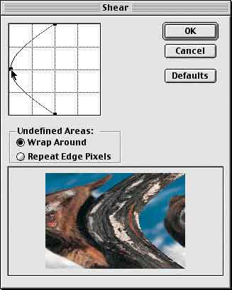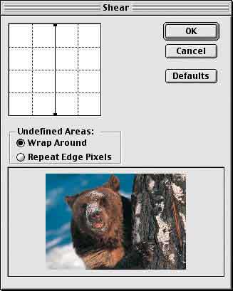 The center of the dialog box is where you’ll find the only tricky part of the Shear filter, the choice of options for Undefined Areas. Parts of the image are considered “undefined” when the original pixels are moved away from an edge and there are no neighboring pixels to replace them. As you warp an image, pixels move past the edge of the selection and can be wrapped around to the other side of the selection: