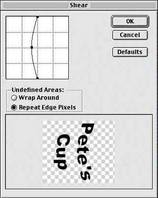 Using the grid as reference, we can see that in the width of the text (in this case, since it’s rotated, the height of the text from the “P” to the “s”), the cup’s rim dips approximately one-third the height of the letter P. In the Shear dialog box’s preview window, we can use the transparency grid to help us guess-timate the approximate curve.