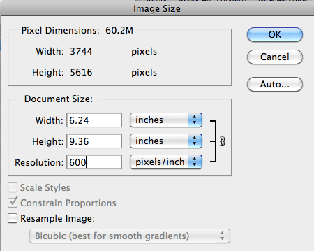 The Image Size dialog box gives you visual clues as to the relationship of the print size parameters In the Document Size Area, the black line thingy to the right of the Inches pop-up menus indicates that Width, Height, and Resolution are locked together. You can’t change one without changing another. For example, if I set the resolution to 600, the print size goes down, as reflected in Figure 3.