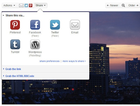 When you find an image on Flickr that you like or are inspired by, you click the Share menu and Pinterest shows up as an option. When a photo is pinned from the Flickr share menu, the image attribution is attached to it, ensuring that the photo is properly attributed. Flickr users who do not want their images shared have the option to disable the Pinterest button as well.