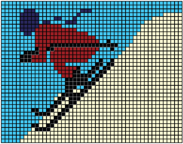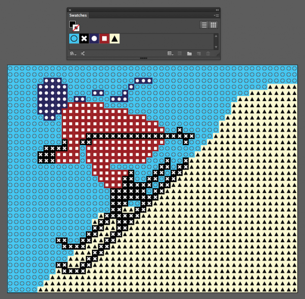 This artwork contains five different fill colors, and each one of the fill colors needs to also have a unique shape contained within each square.