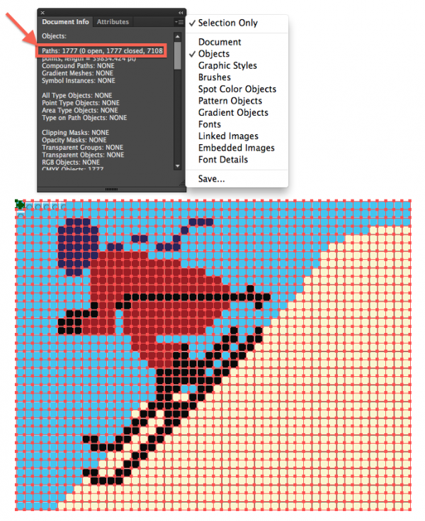 But in our case, we don’t have a single large object, we have 1776 different objects to which we need to apply a pattern swatch. (In case you’re wondering how I determined the number of objects, go to Window > Document Info > Flyout menu > Objects. There are 1776 squares and 1 circle.) So we need to find a way to precisely position each swatch pattern inside each of the 1776 squares.