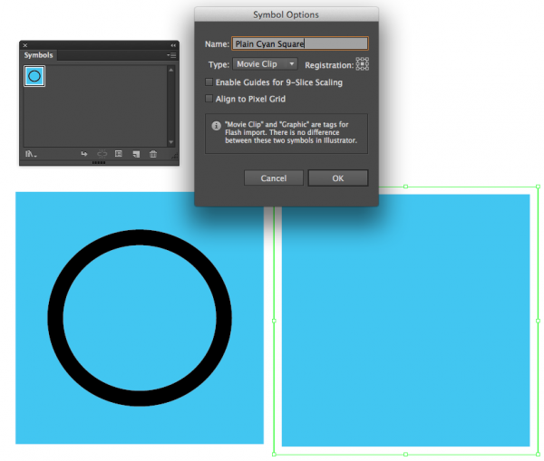 Let’s take a look once again at our design. What I really want is a grid of these cyan squares, all filled with circles. But the circles can’t just be placed willy-nilly. They need to be exactly in the center of each square. It seems simple enough: choose Go to Object > Pattern > Make. The default Tile Type is Grid, which is exactly what we want. (For our purposes in this project, nothing else in the dialog box matters. We’ll just leave it all at the default settings.)