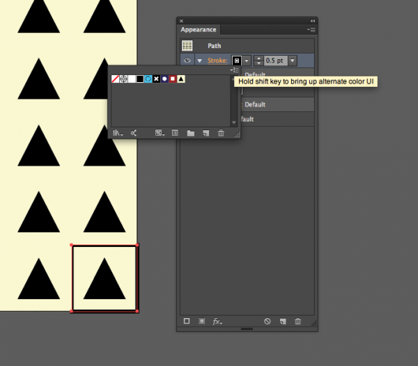 You can also add strokes and fills to objects using the Appearance Panel. That way, you can have just one panel open instead of two. Clicking on the Stroke color will bring up your color swatches. If you’d prefer to see the Color sliders, hold down Shift while you click on the Stroke color picker in the Appearance Panel