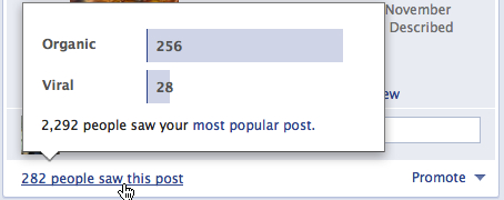 Figure 1: If you have a business page, Facebook shows you exactly how many people have seen each of your postings — and even breaks that number down into how many of your fans saw it organically in their News Feeds versus how friends of your fans saw it virally.