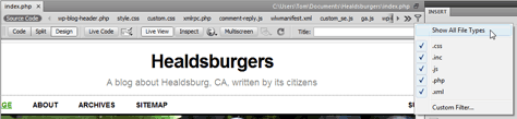 Figure 2. You can use the Related Files toolbar’s Filter pop-up menu when you want to display and focus on certain file types. Click the image below for a larger version.