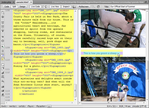 Figure 5. When you have CSS Inspect and Live Code both active, hovering over a page element is reflected in both the code and rendered views. Click the image below for a larger version.