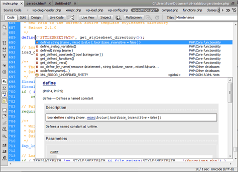 Figure 6. Improved PHP code hinting includes help with a function’s syntax and parameters. Click the image below for a larger version.