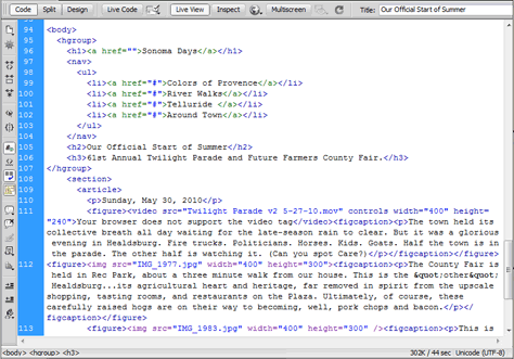 Figure 8. This HTML5 document contains many new tags that are part of the new specification; here, you can see hgroup, nav, section, article, figure, and video. Click the image below for a larger version.