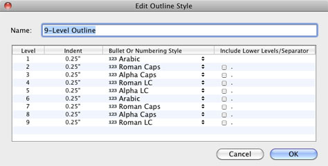In the Edit Outline Style dialog, you define Outline Styles, which can have up to nine levels.