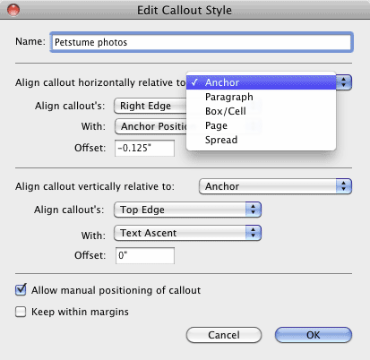 In the Edit Callout Style dialog, you define how you want a callout to be attached to a callout anchor in the text. The options change as you make your choices in the popup menus. In this case, the top of the photo will remain aligned with the callout anchor that was created at the beginning of the paragraph, and positioned .125″ outside the text box.