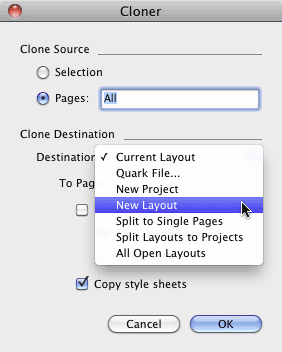 Cloner. With Cloner, you can copy items or entire pages to other pages, layouts, and even other QuarkXPress files. Cloner can also combine layouts or split them apart, and split layouts into separate pages. Imagine being able to copy (clone) a page item from one layout onto several others, all at once. Production pros will appreciate the time-savings of splitting a multiple-page layout into separate pages, or breaking apart all layouts in one project into separate projects.