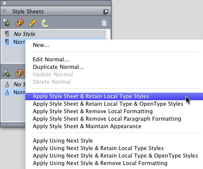 Style Sheets. Quark has improved your options to override local formatting when applying Paragraph and Character Style Sheets. For example, you can keep italics and boldface but make all other attributes match the Style Sheet. Or, you can keep advanced OpenType formatting intact while changing the rest of the text attributes. (This is a pet peeve of mine in previous versions, as well as in InDesign.) You can even apply a style sheet without changing the appearance of the text at all! This is like applying a logical structural definition to a paragraph without changing how the text looks.