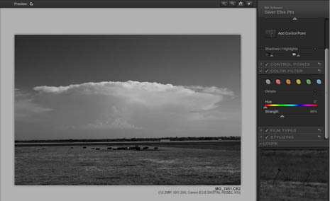 Silver Efex automatically creates a mask that limits the effect of the darkening to only the blue of the sky (Figure 9). If I drag the same point onto the ground, then only the ground is darkened, because now the mask defined by the Control Point is based on a different color.