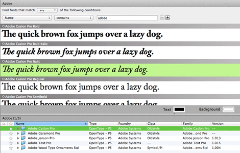 Once installed, Suitcase Fusion takes an inventory of all your installed fonts and puts them in a library. From there you can create individual sets that can be activated or deactivated with a click. Adding new fonts is a simple drag and drop procedure. Smart sets take that idea that one step further. These are sets that you can create based on search criteria. For example, you can create a set with all of the fonts with “Adobe” in their name: