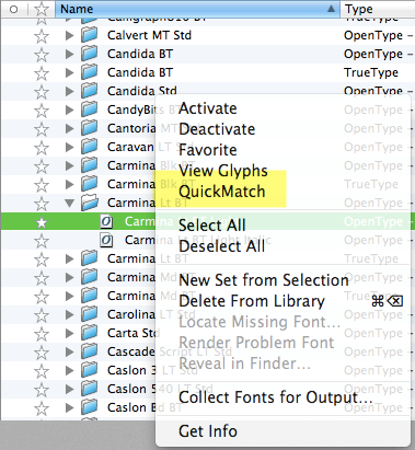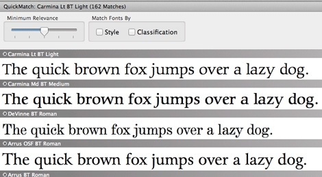 Another very useful feature, Quick Match allows the user to select a font and find similar fonts by right clicking and choosing Quick Match. A slider is available to narrow the relevance, and the matches can be made based on style or classification. This is a real time saver when looking to freshen up a design without going too far.