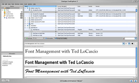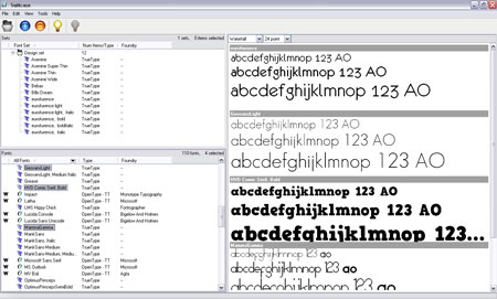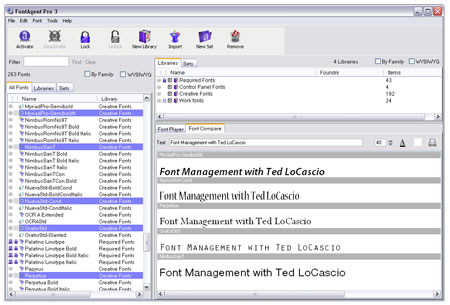 You can view fonts in libraries and sets in either the left or above-right panels, or both. However, to display all fonts in the database, you must select the All Fonts tab in the left panel. Fonts selected from the All Fonts, Libraries, or Sets tabs display in the bottom-right panel. You can view fonts individually by font name, or grouped by font family. You can also see fonts as WYSIWYG. By clicking the Font Compare tab in the preview panel, you can preview multiple selected fonts side-by-side using custom text (Figure 3).