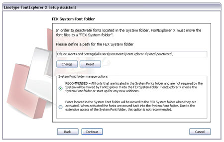 Once it creates the database, FontExplorer X for Windows (FEX) tells you that all of the fonts in the system Fonts folder must be deactivated and moved to a FEX System folder (C:Documents and SettingsAll UsersDocumentsFontExplorer XFontsdeactivate). You can keep all fonts not required by the system in the FEX System folder (recommended) or move them back to the system Fonts folder upon activation (Figure 4).
