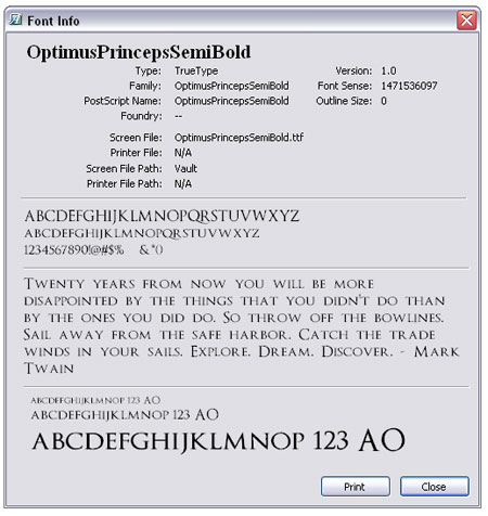 In addition to Waterfall, Paragraph, and ABC 123 preview options, Suitcase for Windows also has a QuickType feature that lets you enter custom preview text. To view all of the preview options at once (with the exception of QuickType), select the font and choose Get Info. This opens a separate window that you can also print from (Figure 8).