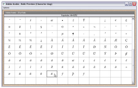 Preview windows contain their own set of Options, some of which are very useful. For example, Character Map displays the corresponding keystroke for any glyph you select (Figure 11).