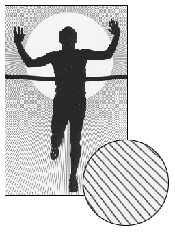 In some cases, the grid in the artwork is an intrinsic part of the imagery. For example, a photograph of a regular structure — such as the grid in a screen door or the pattern of a checked fabric — can produce a moiré pattern when scanned. Even black-and-white drawings can contain regular grids. Moiré patterns created in this way are known as “content moirés.” Figure 2 illustrates what can happen when you scan a piece of line art that contains a radiating line pattern. The circular inset (lower right) provides a full-size view of the background pattern. And as you can see, the pattern itself is perfectly regular. But when zoomed out or reduced for display on a monitor, the symmetrical pattern is transformed into a kaleidoscopic pattern.