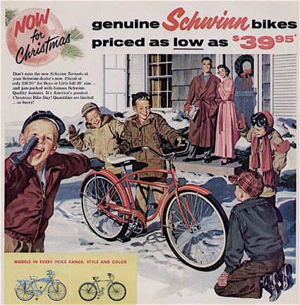 Figure 14. In 1956 when this ad ran, getting a new bike was a neighborhood event, as it still was in my youth. Every Christmas morning the kids would come out and show off any new models or bike accessories that Santa had brought.