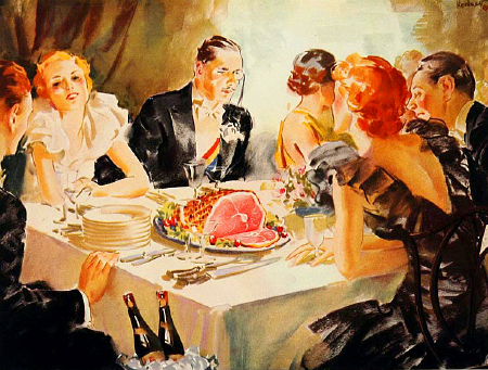 Figure 3: Ham graces the most sophisticated dinner tables. This series includes a 1930s ad from the Morrel company (top); a suggested ham-themed table arrangement from a 1962 article in Family Circle Magazine (middle); and a 1962 image from Swift’s Premium Hams (bottom).