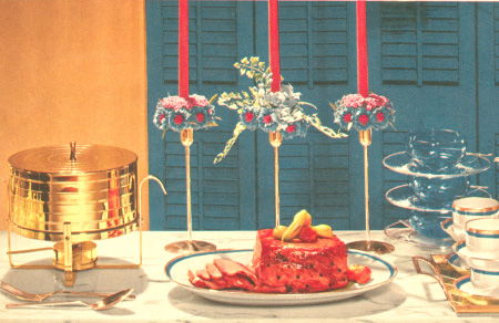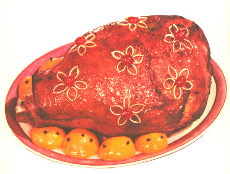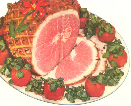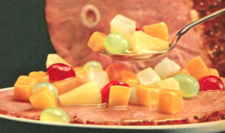 Figure 5: Hardly the “other white eat,” ham is often very colorful, as shown here. Top, a 1957 image of ham with apricots from the Family Circle Meat Cookbook; middle, a 1950s illustration from the Continental Can Company; and bottom, a 1964 photo from Good Housekeeping magazine article titled “Look what you can do with fruit cocktail!”