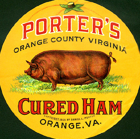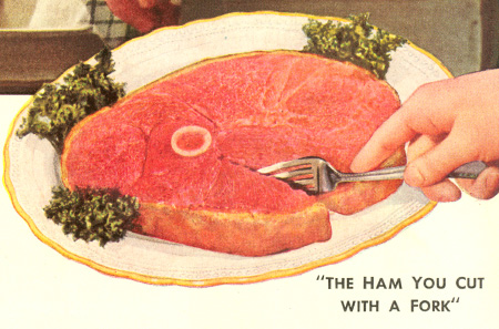 Figure 4: All animals technically have “hams,” but in the United States we use the term almost exclusively for pork. Top, a 1952 illustration from the National Live Stock and Meat Board; middle, a 1925 label for Porter’s cured Virginia Ham; and bottom, the ham you can cut with a fork, from Wilson circa 1937.
