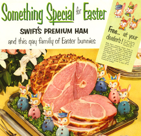 But before we go deeply into Easter ham, it should be noted that once you remove the religious imagery, Easter is visually about many other animals. Bunnies, baby chicks, little lambs, and other barnyard animals are often part of the Easter parade, though you rarely see pigs in Easter visuals. I can’t explain this as people are known to eat rabbit and lamb for Easter dinner, and certainly some eat chicken, too, so it’s not about trying to disassociate what’s on the dinner table from what’s on the greeting cards and in the candy baskets.