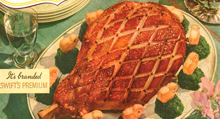 Figure 7: Ham isn’t just a meat, it’s a topic of conversation! Top, a 1937 package of Armor ham, “the ham that am”; middle, the heading for a newspaper column giving advice on in 1943; and bottom, the mellow richness of Swift’s brown-sugar-cured ham as advertised in the early 1950s.